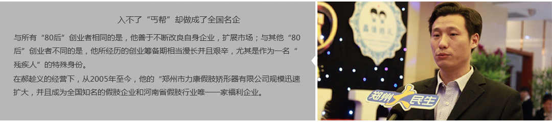 鄭州市力康假肢矯形器有限公司(簡稱力康),是一家專業(yè)從事假肢矯形器的設計、研發(fā)、制作及裝 配的專業(yè)機構。成立于1992年是河南省唯一一家福利企業(yè)。力康下設業(yè)務部、技術部、住院部、康復 部、售后服務部,并配有現(xiàn)代化的裝配車間和功能齊全的訓練大廳,為殘疾朋友康復訓練提供了可靠 保障??偨?jīng)理穿戴假肢多年,有著豐富的臨床經(jīng)驗和親身體會;多年來,力康已為全國幾十萬名殘疾 朋友安裝上舒適、美觀、耐用的假肢和矯形器具,使他們更大限度地恢復了正常的工作和生活?!爱a(chǎn) 品即人品”的質(zhì)量理念、先進的技術、實惠的價格、完善的售后服務是力康取勝的法寶……